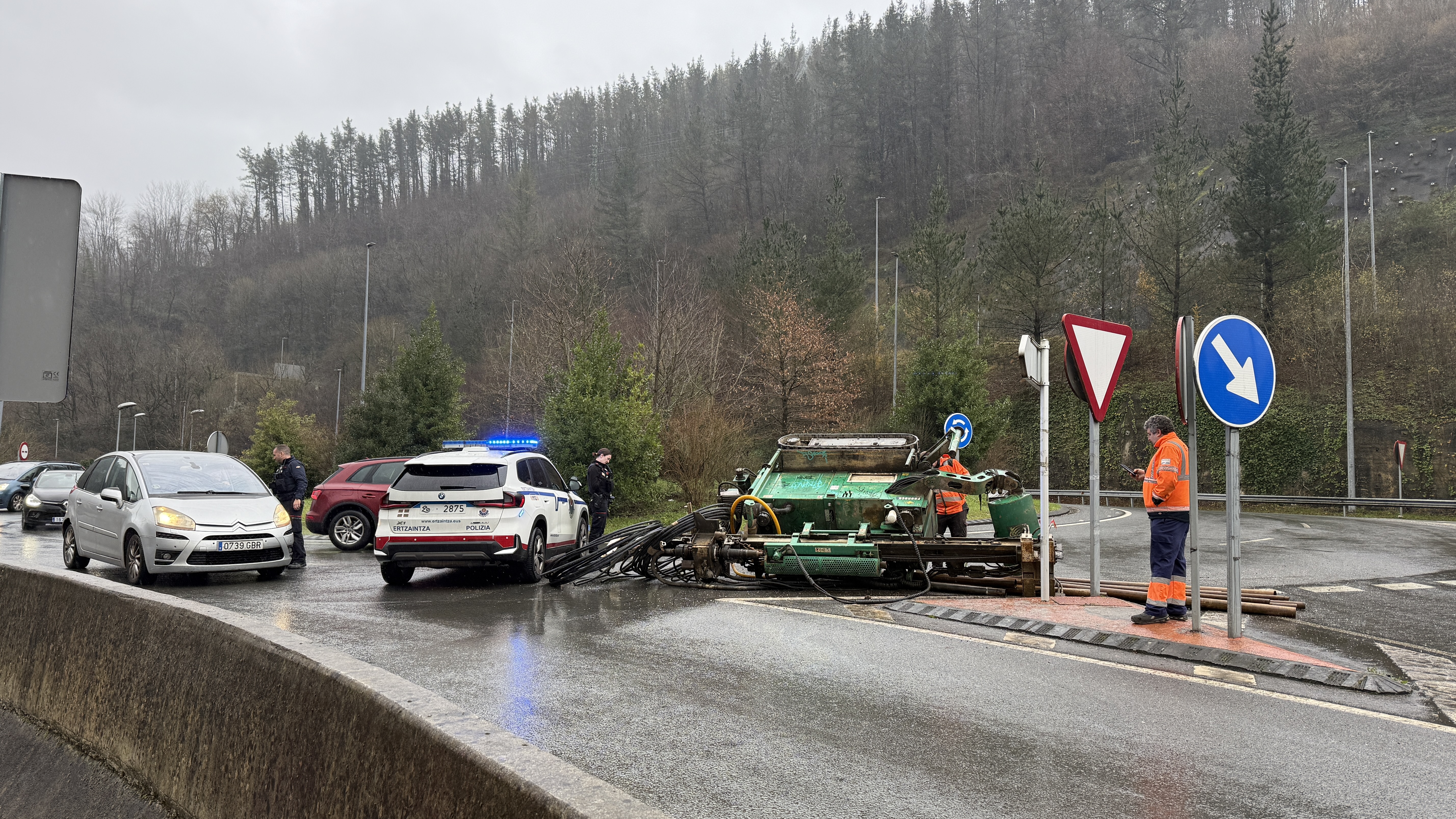 Garabi batek zeraman sondeo-makina biribilgunean erori da eta bi erreietako bat oztopatu du. Ertzaintza bertaratu da eta trafikoa bideratzen dihardu. Azaldu dutenez, bi norabideak erabilgarri daude eta “motel baina arazo barik” pasatu daitezke ibilgailuak. Kamioi-pluma bat bidean da makina jasotzeko.