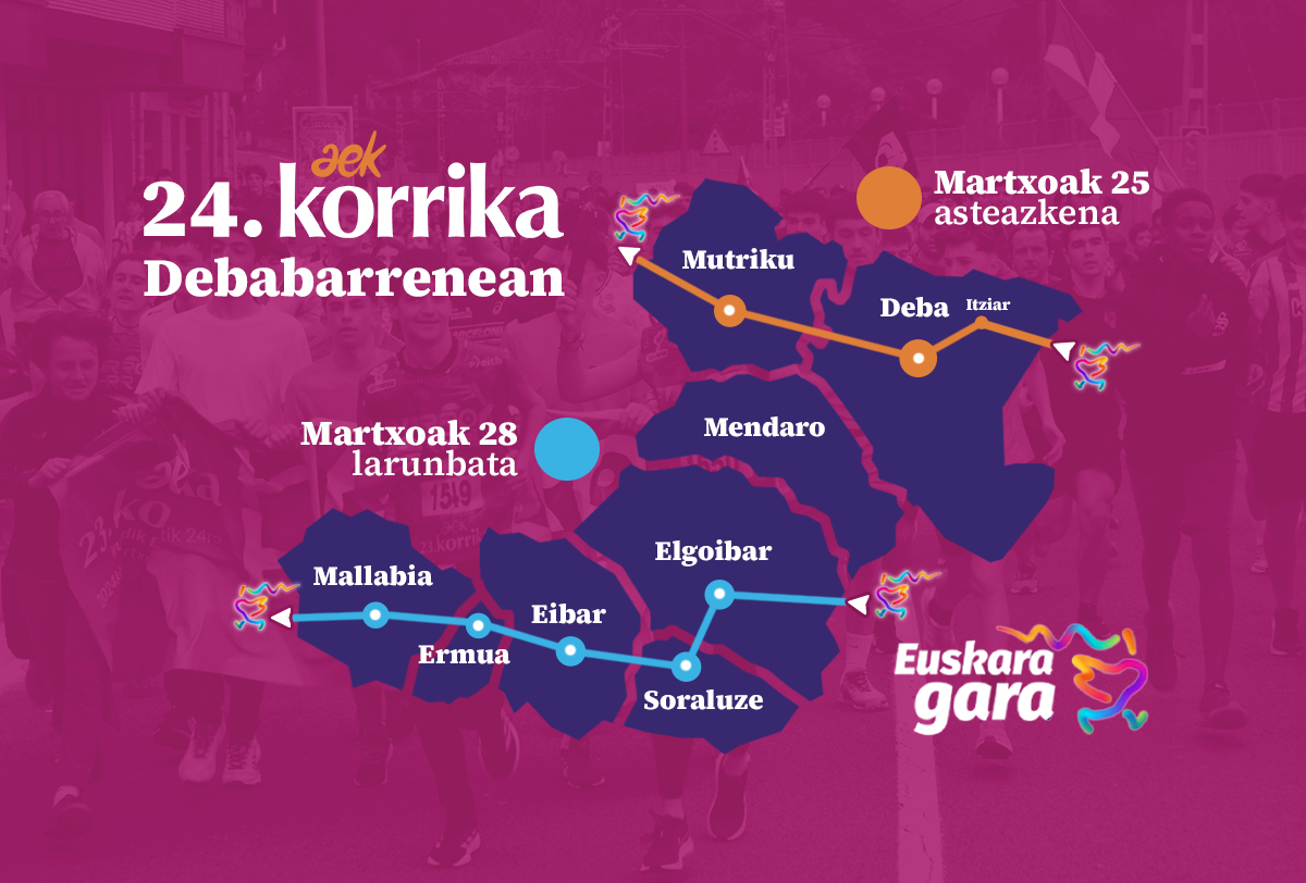 Bidean, jakina, gure eskualdetik ere pasatuko da Korrika. Martxoaren 25ean iritsiko da Debabarrenera (asteazkena), Urola Kostatik, Zumaiatik. Iluntzean iritsiko da Itziarrera, 17:59ak aldera. Debako herrigunera jaitsiko 18:57ak aldera iritsiko da. Debatik Mutrikura egingo du gero, eta Mutrikura 19:23ak aldera iristea espero da. Mutrikutik Bizkairako bidea hartuko du, eta hiru egunen buruan, martxoaren 28an (larunbata) iritsiko da berriro gure eskualdera euskararen aldeko lasterketa, oraingoan Azkoitia aldetik. Azkaraten behera etorriko da, eta 19:26ak aldera sartuko da Elgoibarren. Elgoibar gurutzatu ondoren Soraluzerantz hartuko du. 20:36ak aldera iritsiko da hara, eta Soraluzeri itzulia emanda, berriro ere atzera egingo du, Eibarren sartzeko. Eibarren, 21:11ak aldera espero dute, eta 22:00ak izango dira Ermura iristerako. Mallabiatik ere igaroko da Korrika egun horretan bertan, 22:29ak aldera. Honatx lekukoaren ailegaera orduak eskualdeko herrietara: