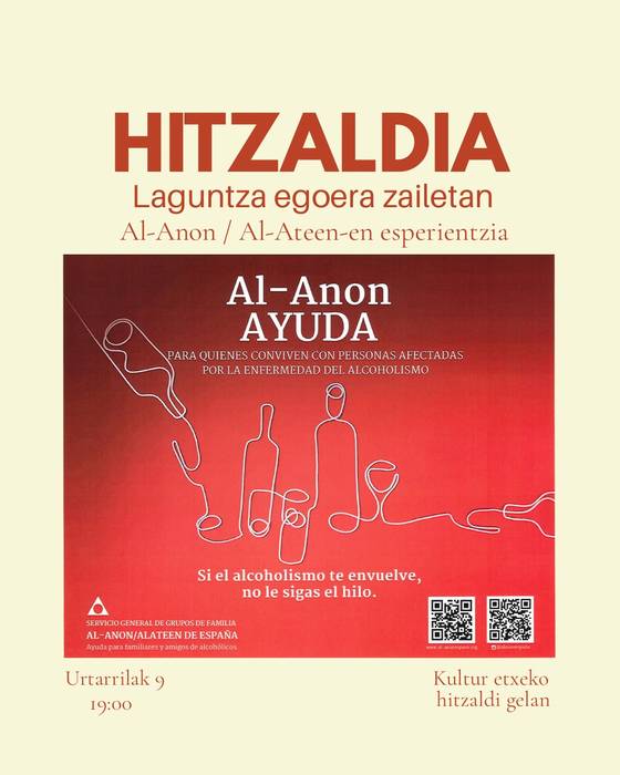 Elgoibarrerako antolatu duten solasaldian, Al-Anon/Alateen taldeen funtzionamendua nolakoa den azalduko dute, eta baita alkoholismoa moduko gaixotasun bati aurre egiteko dauden laguntzen eta baliabideen berri eman ere. Horregatik, “Elkarren arteko laguntza egoera zailetan: Al-Anon/Alateenen esperientzia” izena jarri diote hitzaldiari.