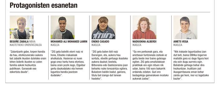 Salatu dute ezinei erreparatzeko joera dugula, oro har, denok, gaitasunei erreparatu ordez. "Bidaltzen duzu curriculuma enpresetara, deitzen zaituzte elkarrizketetarako, baina jabetzen badira desgaitasunen bat duzula, berehala baztertzen zaituzte, ez badaude, behintzat, derrigortuta enpresa handia izateagatik desgaitasunen bat duten langile kopuru bat hartzera. Etsigarria da", aitortu du Casadok. "Jakina dela etsigarria. Niri kosta egiten zaizkit gauza batzuk, baina hizkuntzak ikasteko erraztasun handia daukat, adibidez, eta taldean lan egiteko gaitasun handia", gehitu du, aldamenetik, Mohaned Laminek. "Ezingo ditugu gauza guztiak egin, baina ba al dago dena egin dezakeenik? Edozelan ere, gauza bat dago hemen argi: guri ere gainerakoei dagozkien eskubideak izatea dagokigula eta hori bermatu beharra dagoela", zehaztu du, ondotik, Alberdik. ZIG gelako ikasketak amaitu zituenean mekanika enpresa batean egin zuen lan uda batez Alberdik: "Udan lan egin nahi genuen galdezka etorri zitzaizkigun gelara, eta denok erantzun genuen baietz. Hasi nintzen, eta, egia esan, oso gustura aritu nintzen lanean, baina 100 euro irabazi nituen. Lana gustuko nuen, baina baldintzak ez".