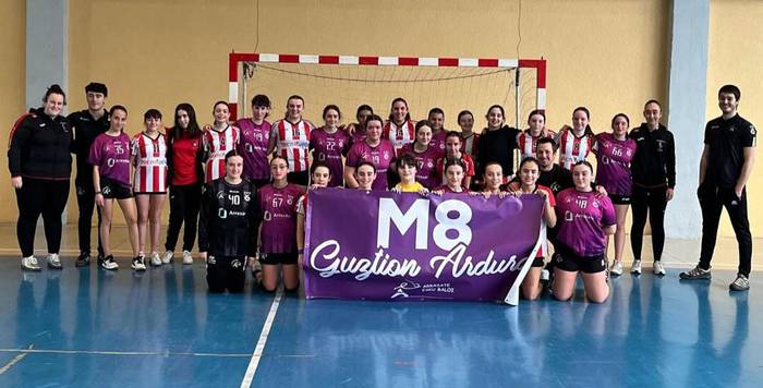 Asteburuan jokatu duten Sanloko taldeek gogoan eduki dute Emakumeen Nazioarteko Eguna. Jokalariek more koloreko eskumuturrekoekin jokatu zituzten partidak.