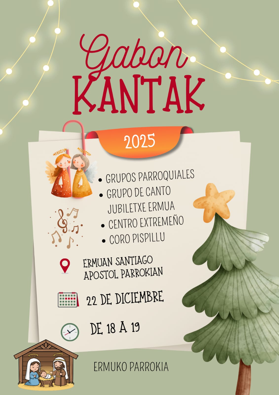 Urtero bezala, "Gabon kantak" musika jaialdia egingo da Ermuko elizan, eta bertan parte hartuko dute herriko hainbat taldek; tartean, elizako taldeek, Jubiletxeko kantu taldeak, Extremadurako Zentroak eta Pispillu abesbatzak. Hitzordua gaur izango da, 18:00etatik 19:00etara, eta ez da sarrerarik ordaindu beharko.