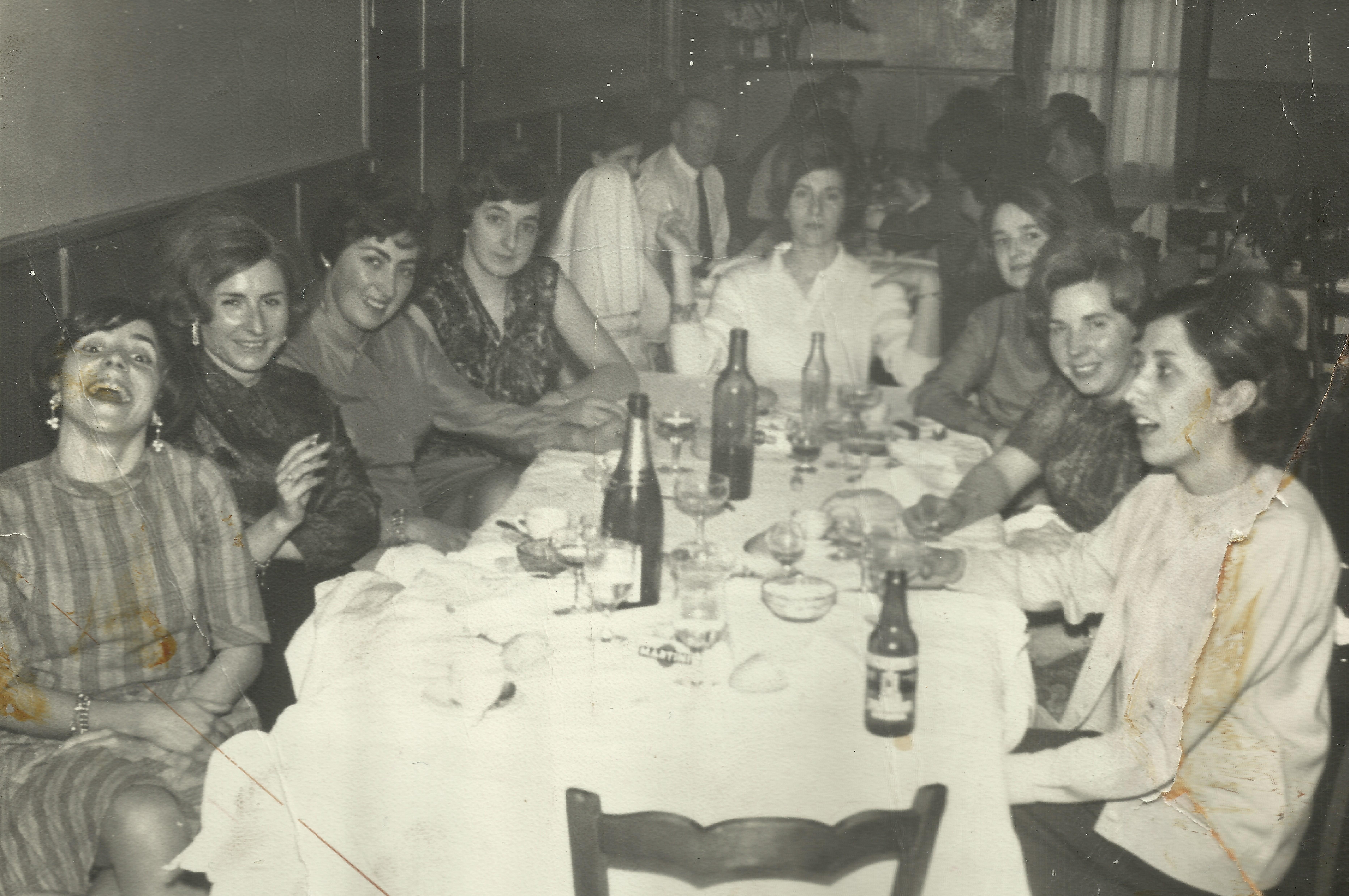 Lagun arteko bazkaria amaitu berritan, kafea eta haren osteko txanpaina ere hartuta, mahaiaren bueltan daude erretratuari ezkerretik eskumara begiratuta Felisa Garitagoitia, Mari Tere Gorosabel, Berta Yarza, Mª Angeles Totorika, Laurita Bilbao, Marivi Bilbao, Inma Solozabal eta Maria Laura de la Haya.