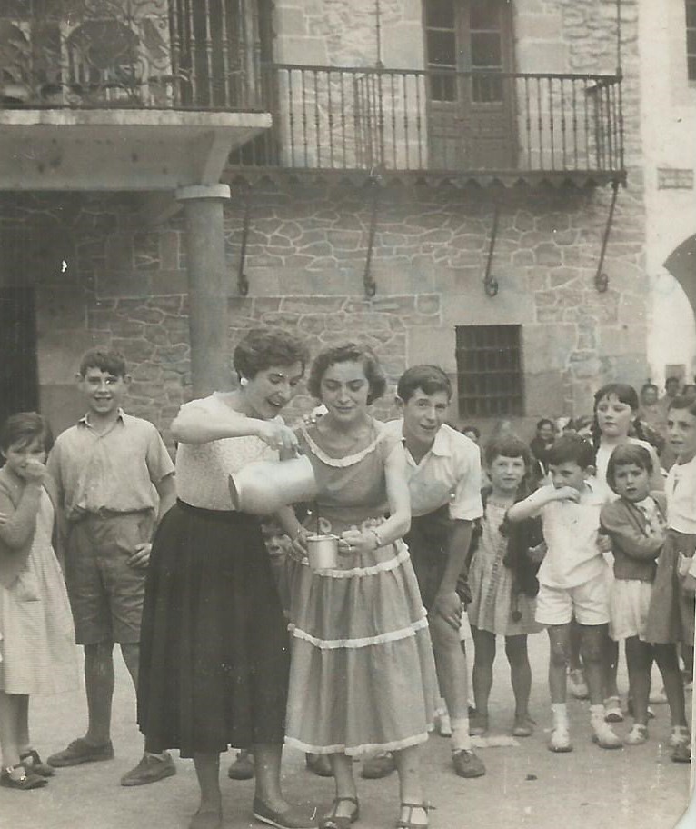 Mari Tere Gorosabel eta Mari Nieves Gastón plazako udaletxe parean pitxar batetik ardoa husten txolopote batera, neska-mutikoz inguratuta. Atzean dituzte, besteak beste, Jose Ignacio Amesti, Pili Ibarrola, Olga Herreria…