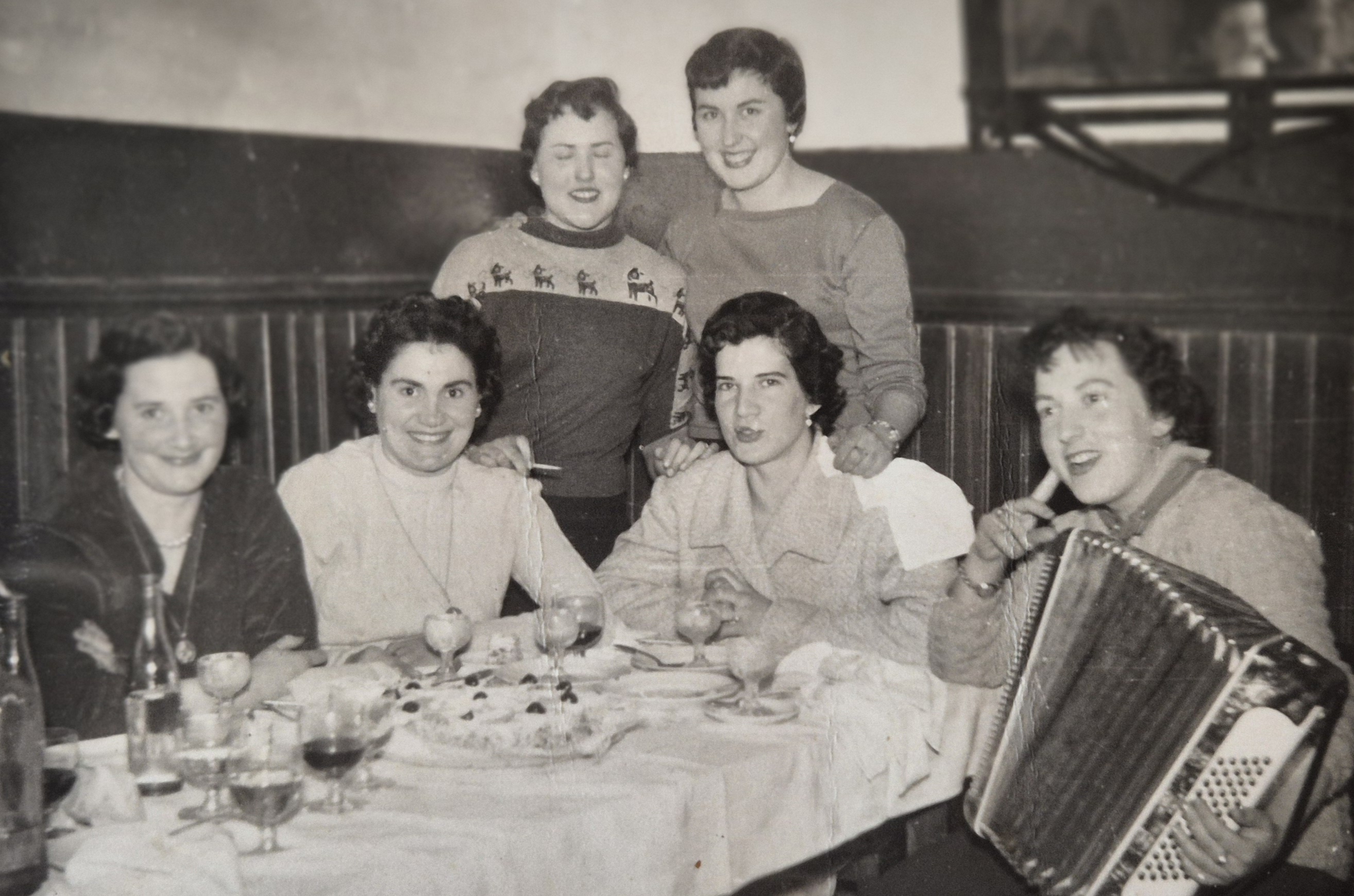 Segundo Varela argazkilari eibartarraren kamerak erretratatu zituen tente, ezkerretik eskumara, Begoña Laka eta Miren Laka. Mahaian Isidora Txurruka, Elisabete Agirregomezkorta, Amaia Gorritxategi eta soinua joten Rosarito Careaga barinagarra. Lagunak pasodobleak, tangoak, balsak eta sueltoko trikiti soinuak joaz dantzan jarri zituen guztiak, ospakizuna erabat alaituz.