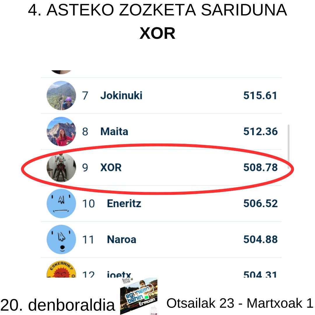 Egunero jokatu dutenen arteko zozketan, 9. postuan geratu denari tokatu zaio saria: XOR , bera, 40 €-ko Ermuko Dendarien Elkarteko dendaren batean erabiltzeko.