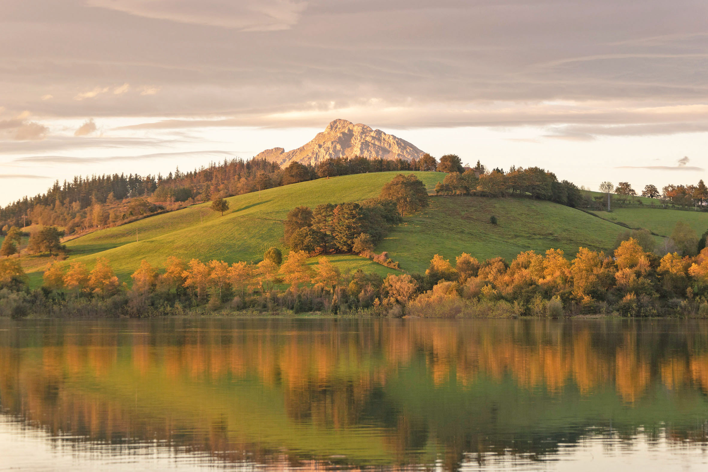 Urkuluko urtegia (Aretxabaleta), Udalatx mendia atzean duela, arratsaldeko argi leunean ikusita. Ibarraren berdeak ur lasaietan islatzen dira.