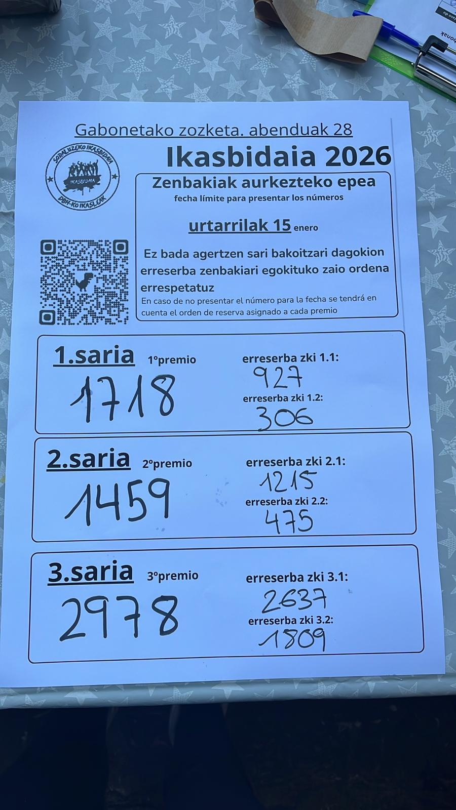 Institutuko ikas-bidaiakoek jakinarazi dituzte zeintzuk diren abenduaren 28ko zozketaren zenbaki irabazleak: lehena, 1.718 (erreserbak 927 eta 306) 230 euro herriko dendetan gastatzeko; bigarrena 1.459 (erreserbak 1.215 eta 475) 150 euro eta hirugarrena, 2.978 (erreserbak 2.637 eta 1.809) 120 euro. Zenbakiak urtarrilaren 15a baino lehen aurkeztu behar dira, bestela, erreserba zenbakiei emango diete saria, ordena errespetatuz.
