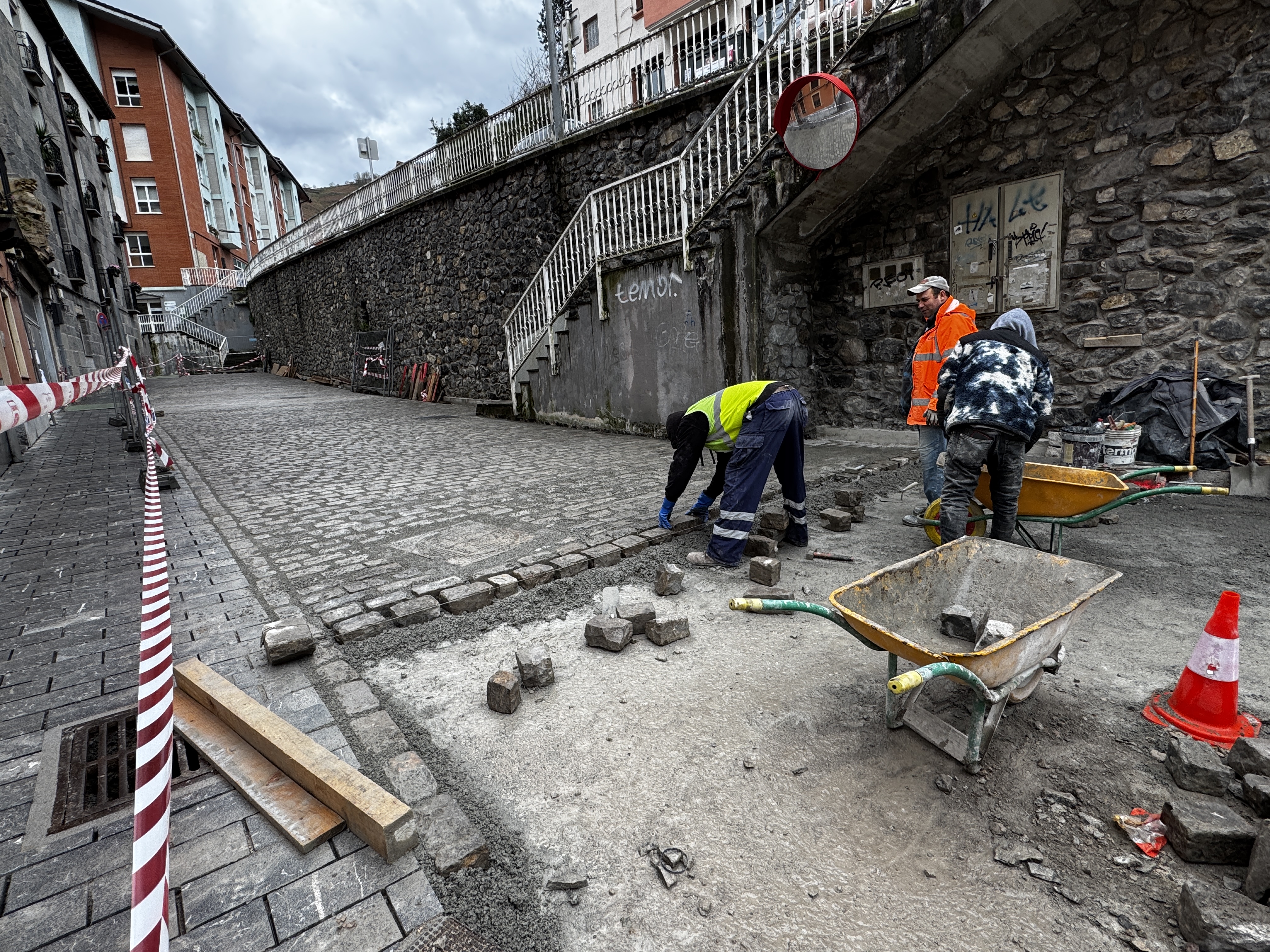 Dena delakoa ere, datozen egunotan zabalduko dute garajeetarako pasabidea eta SAPAtik errepiderainoko tartean segituko dute galtzada-harriak jartzen. Esplikatu dutenez, orain arte bertan zeuden harri berberak jartzen ari dira, baina lehenago harriak garbitzen ari dira, morteroz inguratuta baitaude. Horrek eraginda ere nahi baino motelago ari dira lanean.