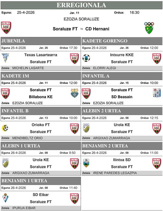 Sorako gainerako taldeen artean, berriz, etxean jokatuko dute Infantil Ak zapatu goizean, 10:00etan, Beasainen kontra. Eta Lehen Mailako Kadeteek zapatu eguerdian, Billabonaren kontra Ezoziko Futbol Zelaian. Kanpoan jokatuko dutenen artean, zapatu goizean, Orion jokatuko dute Infantil B taldekoek, Alegian, berriz, Kadete Gorengoko taldeak, eta, Lasarten Jubenilek.