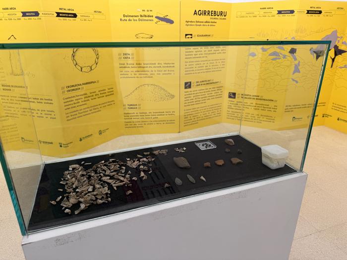 Erakusketari dagokionez, metakrilatozko kutxetan babestuta daude aurkikuntzak. Badaude ere Dolmenen Ibilbidearen mapa bat alfonbra modura eta trikuharriei buruzko informazioa duten panelak.